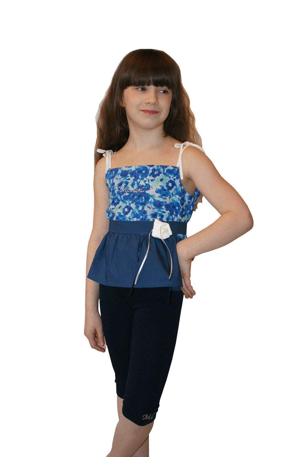 Топ из высококачественного хлопка, нарегулируемых лямках. Топ завязывается на поясе и декорирован стразами и цветком. Удачно подходит для летнего, жаркого дня.