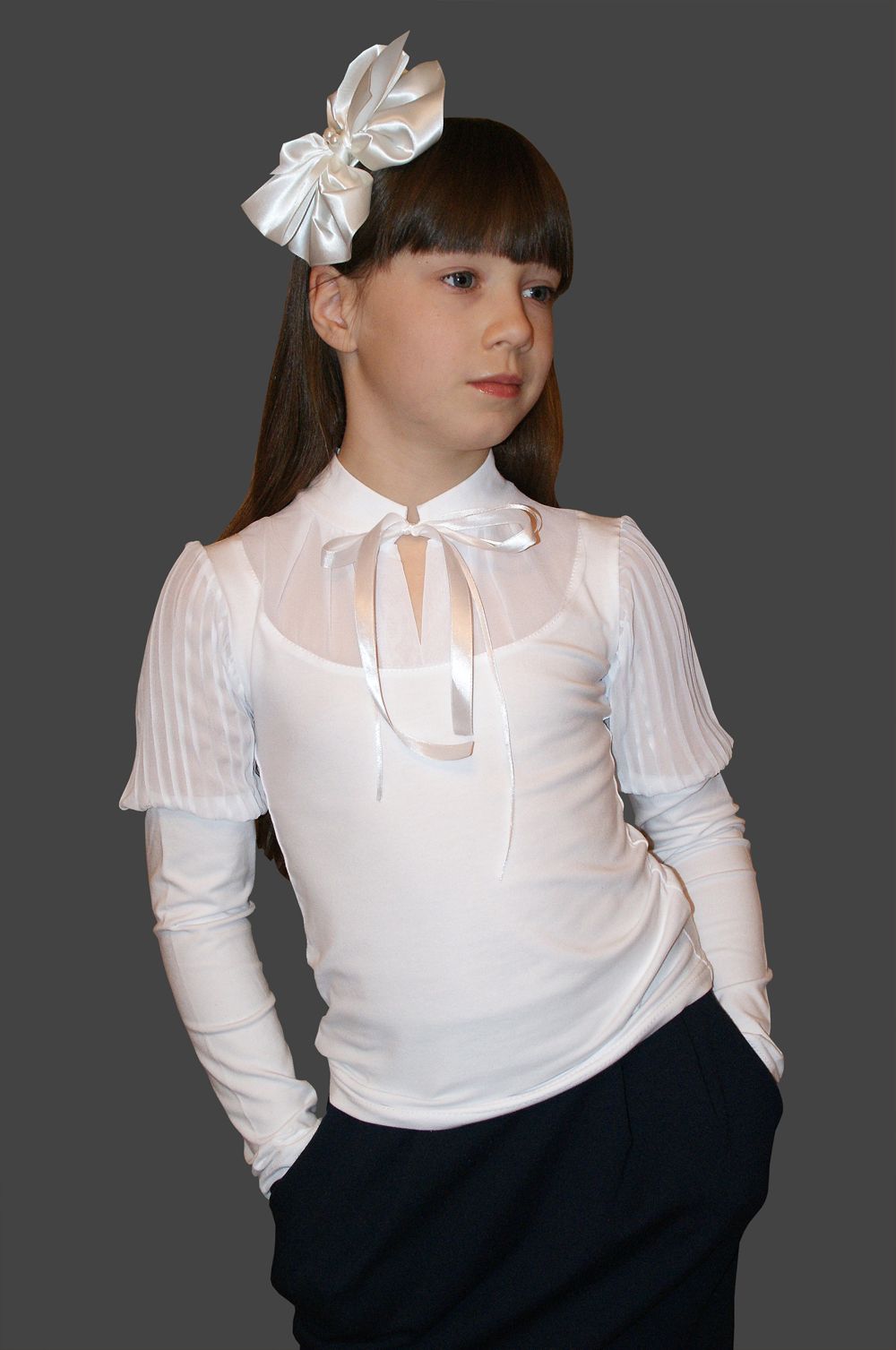 Блузка нарядная для школы. Блузка из мягкого трикотажная на девочку, рукава и кокетка из шифона и плессе, воротник стойка завязывается на атластные ленточки.