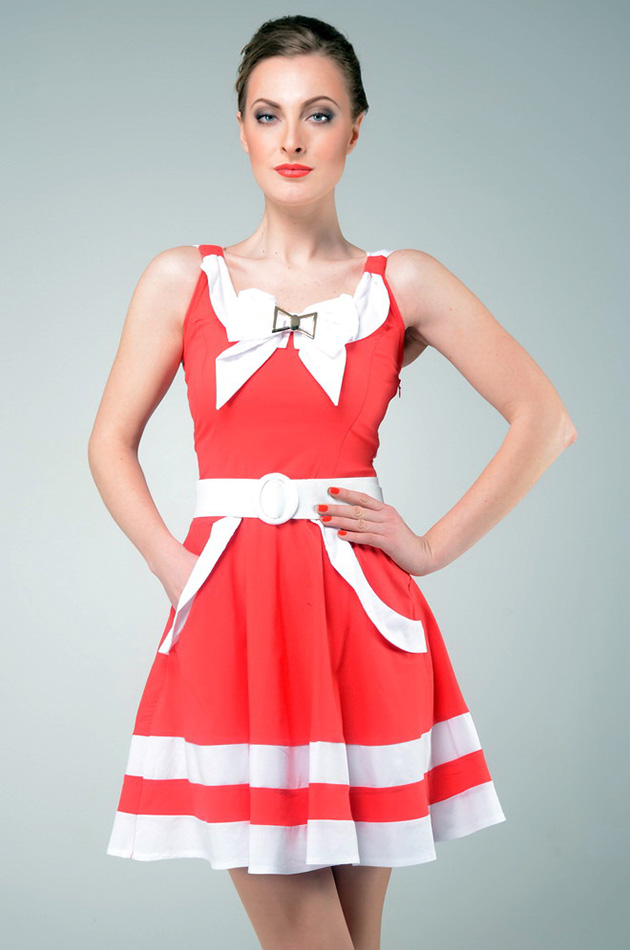 Сарафан облегающий по груди и талии, на груди бант переходящий в брители, на спинке широкая резинка, на талии ремень, юбка расклешенная с карманами, в боковом шве молния.