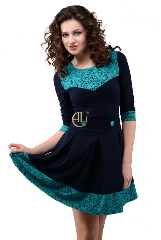 Облегающее по груди и талии, рукав 3\4 с манжетой,на талии две декоративные пуговицы, юбка расклешенная.