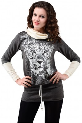 Нижняя часть туники и рукава на облегающей манжете, на швах манжет сборки, воротник хомут с декоративными шлёвками.