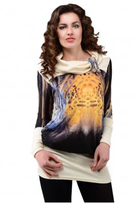 Нижняя часть туники и рукава на облегающей манжете, на швах манжет сборки, воротник хомут с декоративными шлёвками.