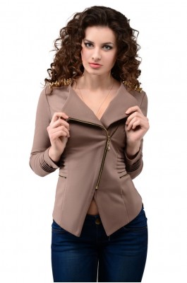 Прилегающий, плечи декорированы шипами, на бочке и по низу рукава горизонтальные складки, на боках декоративные <<молнии>>, полочка длинней спинки, низ бортов острой формы.