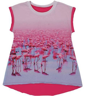 Туника расширенного силуэта, комбинирование цветов, удлинённая спинка полукруглой формы, открытые срезы низа изделия и окантовки рукавов, фотопечать ""Фламинго""."