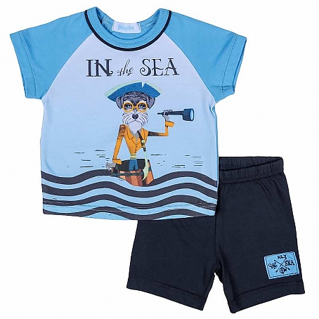 Кулирная гладь 100% хлопок Удобный комплект для мальчика из легкого трикотажного полотна (кулирка)состоит из джемпера и шорт. Яркий джемпер с кототким рукавом украшенный печатью прекрасно сочетается с однотонными шортами с оригинальной нашивкой. Такой комплект станет отличным вариантом для лета.