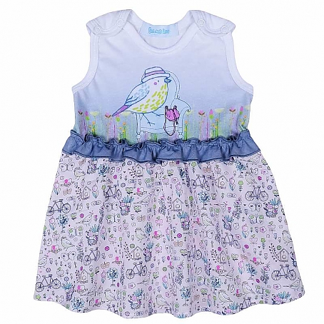 Нежный сарафан для девочки из легкого трикотажного полотна (кулирка), с удобными кнопками на плечах и красочной печатью, будет прекрасно смотреться на ребенке.