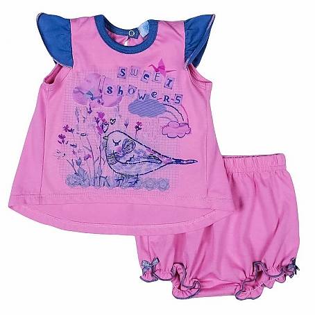 Комфортный комплект для девочки из легкой трикотажной ткани (кулирка)состоит из кофточки и шорт. Кофточка с коротким рукавом и интересной печатью отлично сочетается с однотонными шортами на которых расположены декоративные бантики.