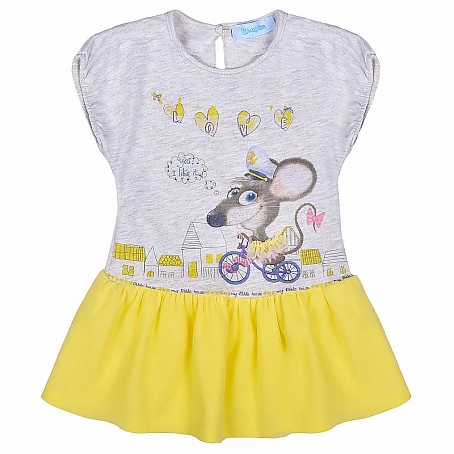 Оригинальное по дизайну платье для девочки с коротким рукавом из трикотажной ткани (кулирка), с интересной отделкой юбки (сетка), красочной печаью и стразами, станет отличным варианом для лета.