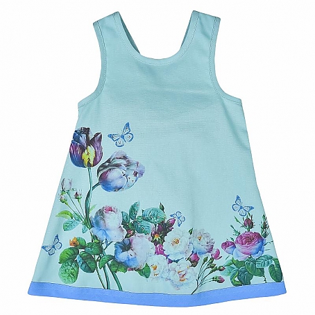 Нарядный сарафан для девочки на широких бретелях из легкой ткани (поплин). Модель дополнена красочным рисунком, стразами, украшена контрастной отделкой и оригинальным по дизайну бантом. Такой сарафан будет прекрасно смотреться на ребенке.