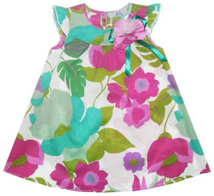 Отрезная кокетка, присборенная юбка, декоративный элемент ""Цветок"" + атласная лента, рукава-крылышки, присборенные по окату, застёжка на спинке на перламутровую пуговицу."
