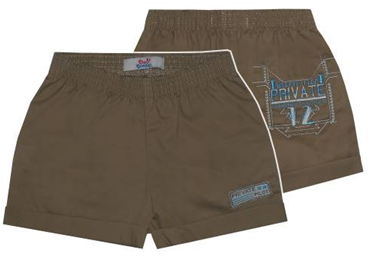 Шорты с застроченными отворотами, небольшая аппликация с вышивкой впереди, крупная вышивка-имитация заднего кармана."