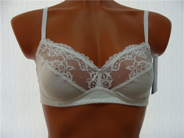 Бюстгальтер из эластичного кружева и эластичного трикотажного полотна. Чашки мягкие без каркасов. Чашка с горизонтальным членением. Верхняя часть чашки выполнена из эластичного кружева . Нижние детали чашек из трикотажного полотна.