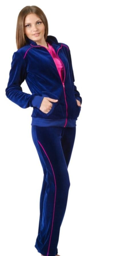 Джемпер женский из трикотажного полотна(велюр) на застежку <<молния>> . По переду джемпера накладные карманы, фигурной формы. Рукав втачной, нижний срез рукава, также как и низ изделия обработан манжетой (рибана). Воротник-стойка. Брюки из трикотажного полотна (велюр). В пояс вставляется широкая 4,0 см эластичная резина и шнурок. Фуфайка женская из трикотажного полотна (95%хлопок,5% эластан) прилегающего силуэта ниже линии талии с коротким втачным рукавом.