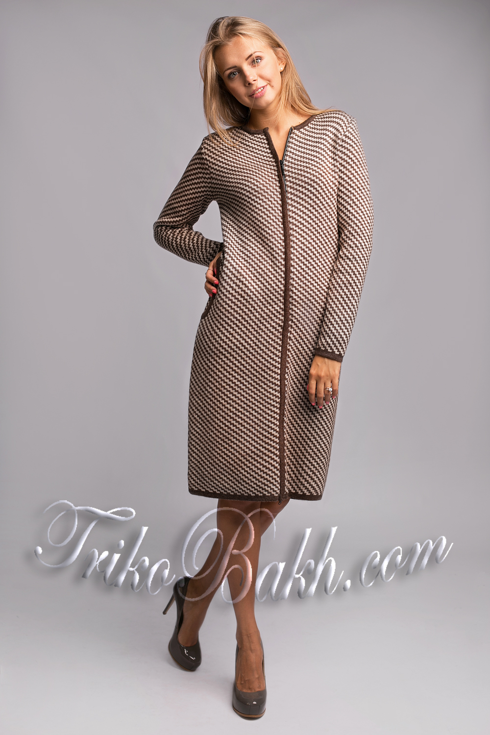 Теплое и плотное вязаное пальто. Двойная жаккардовая вязка, оригинальный узор, прямой силуэт, карманы. Застежка "молния" с двумя "собачками" - снизу и сверху. Круглый вырез горловины, карманы и застежка обработаны двойной вязаной бейкой.