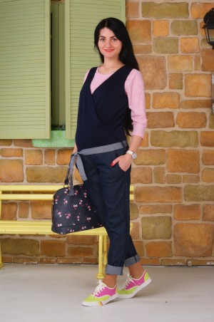 Комбинезон для беременных - это удобный и привычный вариант для будущей мамы. Наш комбинезон состоит из брюк темно-синего денима и темно-синего трикотажного верха из натурального хлопка. Брюки можно подвернуть на модную длину 7/8, тогда будет виден другой серо-голубой цвет ткани, такой же, как цвет пояса, что идет в комплект. В ином случае получится классический стиль брюк. Комбинезон имеет стильный силуэт и делает фигуру визуально более стройной. Подойдет для создания делового образа и для прогулок по городу. Можно носить после беременности. Также этот комбинезон подходит для кормящей мамы благодаря крою трикотажного верха.