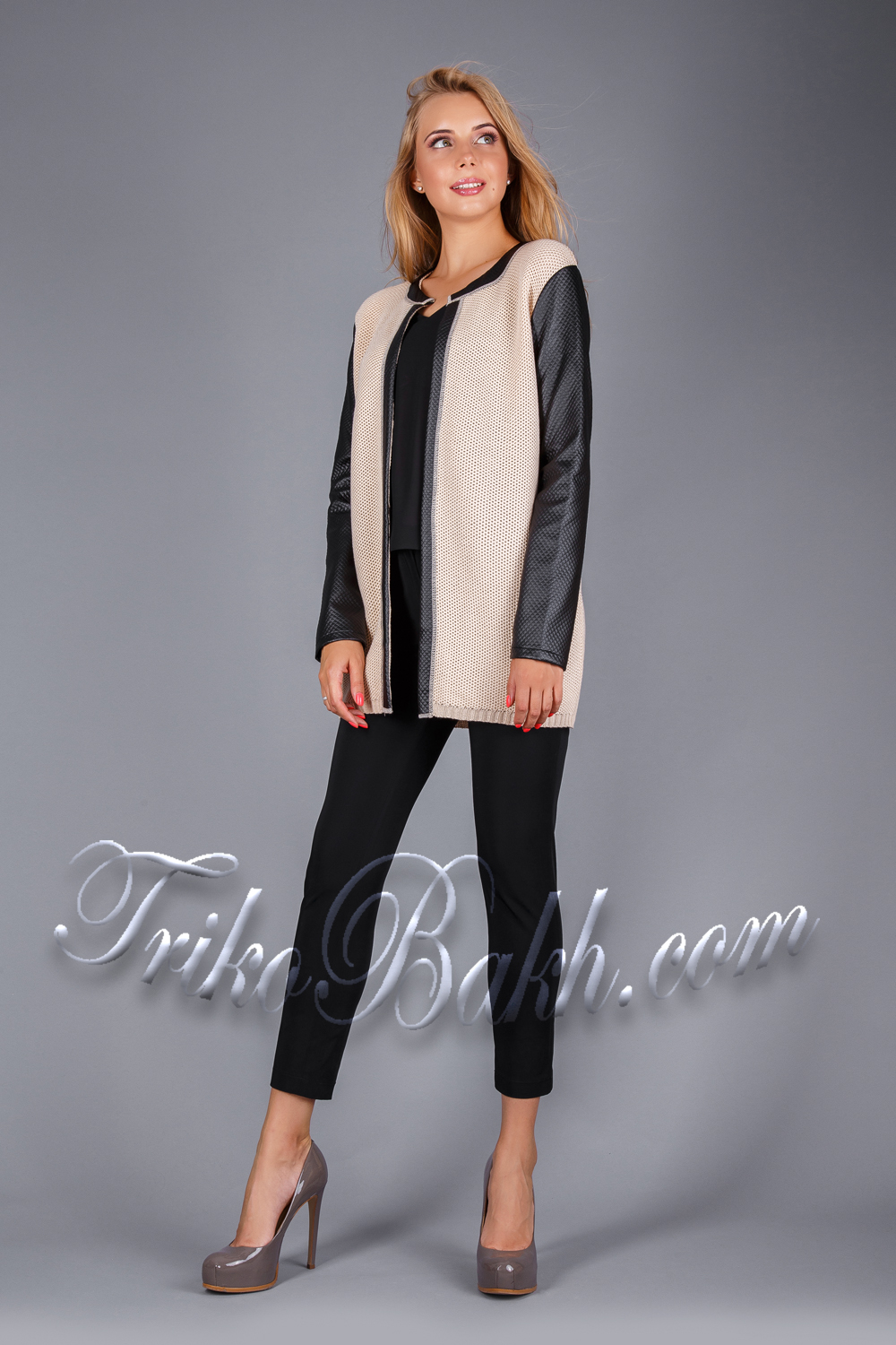 Кардиган из полушерстяной пряжи плотной вязки "соты" в сочетании с рукавами и отделкой из тисненой "эко-кожи"