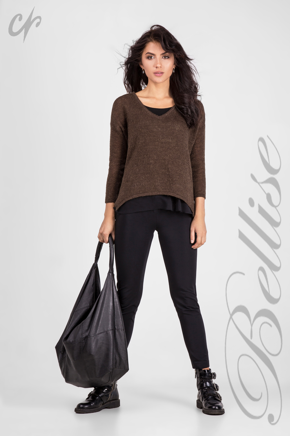 Джемпер тонкий, но очень теплый и слегка колется. В джемпере передняя часть короче, чем спинка по центральной части, спущенная линия плеча, рукав 3/4.