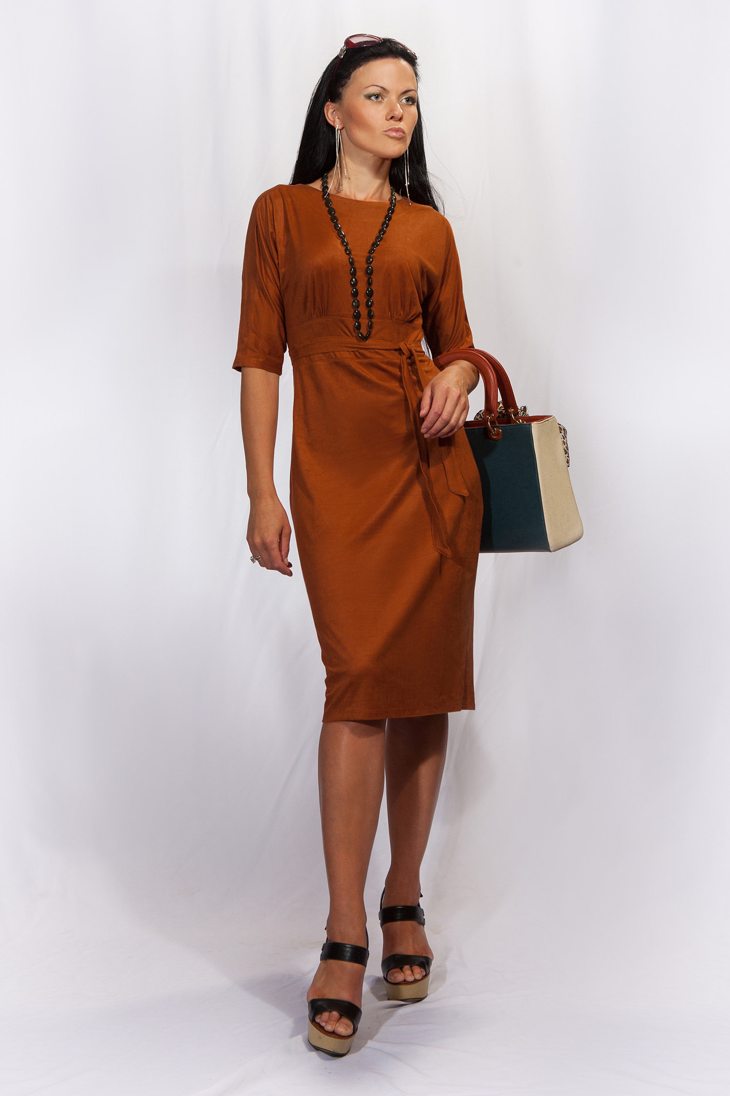 Класс и изыск! Платье из искусственной замши. Слегка завышенная талия, вырез лодочка, цельнокроеные рукава "летучая мышь" длиной 3/4, длина чуть ниже колена, пояс можно носить по желанию