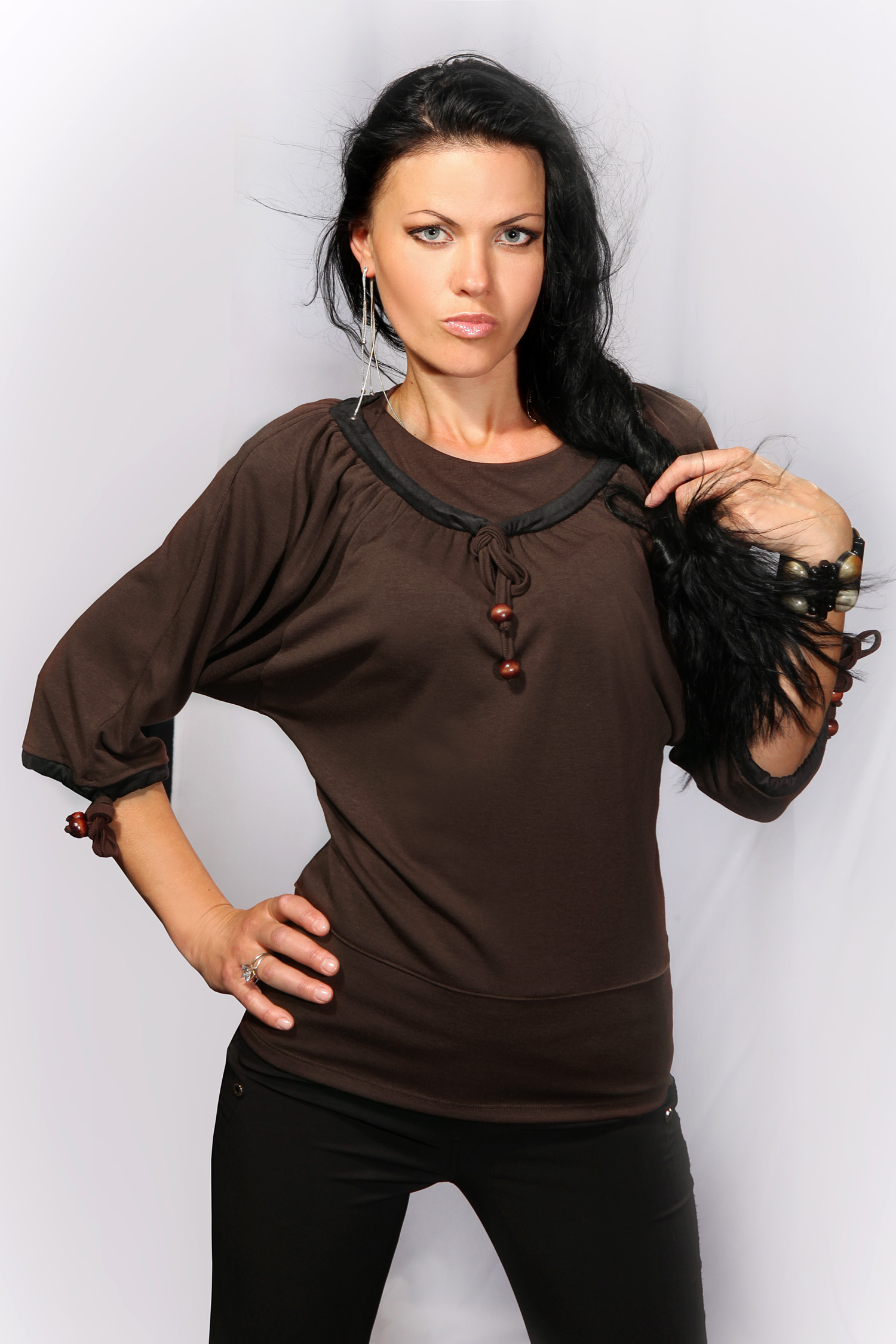 Свободного силуэта блузон для комфортного ношения и удобства! Рукав "реглан" присобранный по линии горловины и стягивающийся на шнурок по низу, горловина округлой формы с декоративной отделкой из искусственной замши, стягивается шнурком с деревянными наконечниками