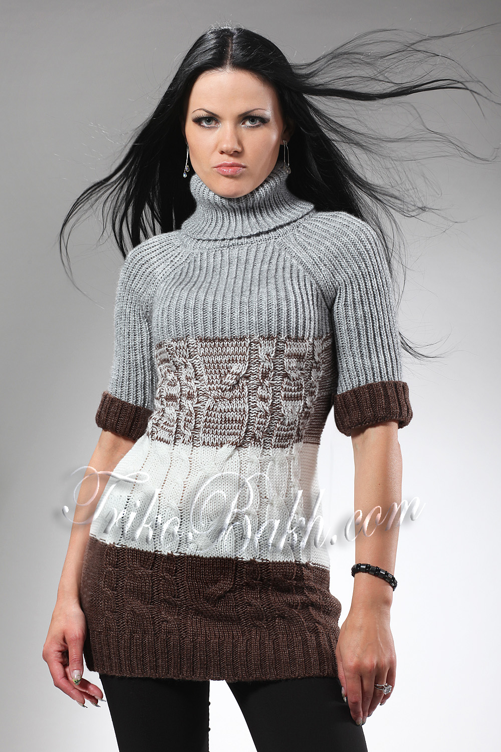 Модный и стильный вязаный свитер из трехцветного меланжа. Рукав "реглан" длиной до локтя с отворотами в рубчик, воротник-гольф связанный резинкой 1Х1, верхняя часть свитера - резинка, на полочке эффектный узор из кос разной ширины и конфигураций