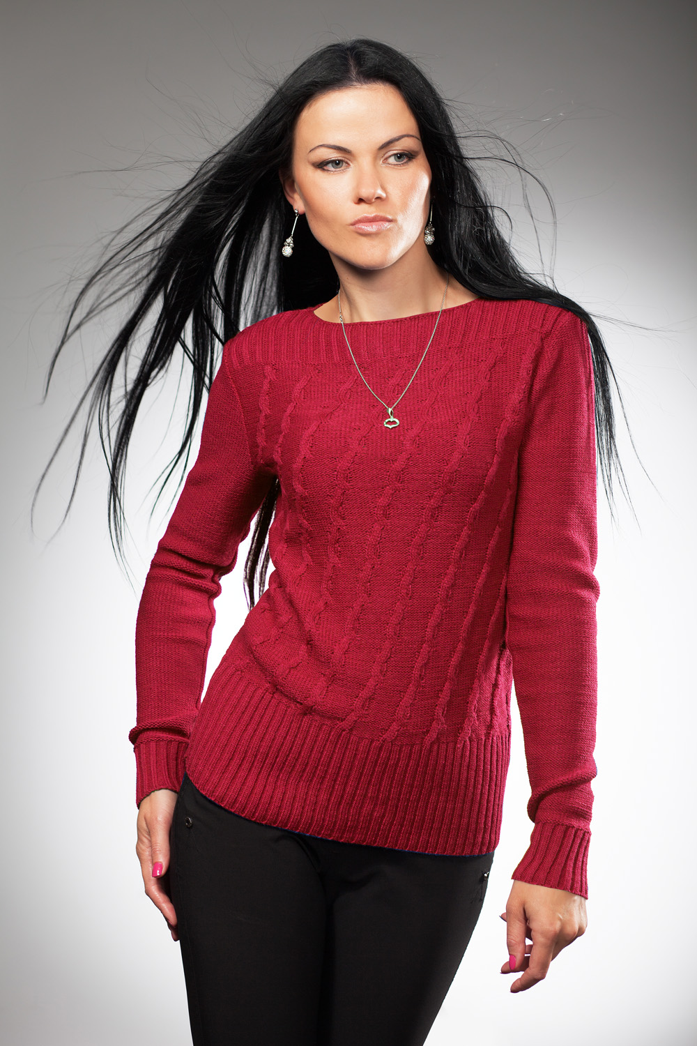 Модный вязаный джемпер. Вырез "лодочка", вывязанный в рубчик, узор - изнаночная гладь, на полочке эффектный узор из "жгутиков" под наклоном